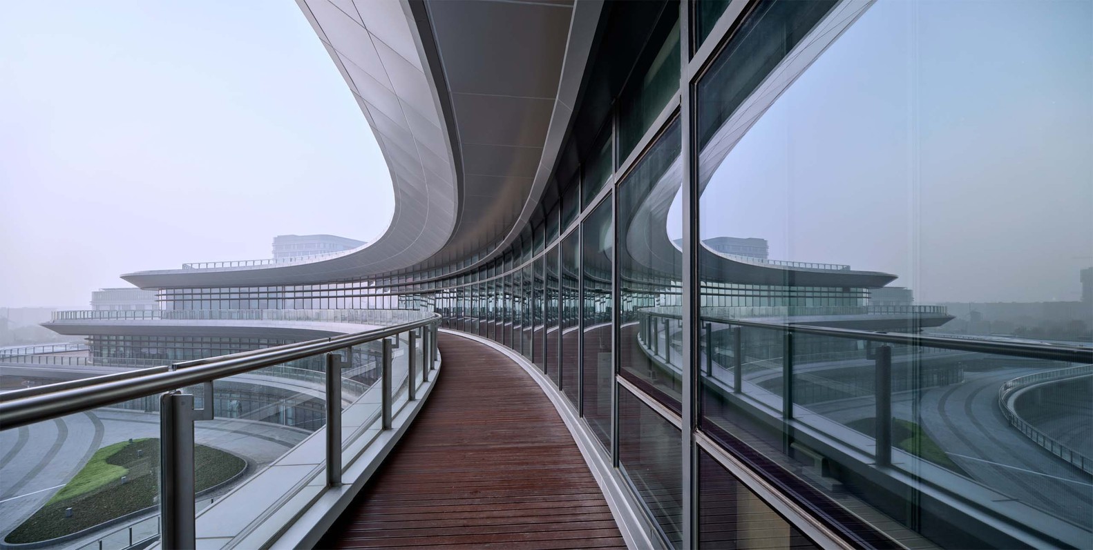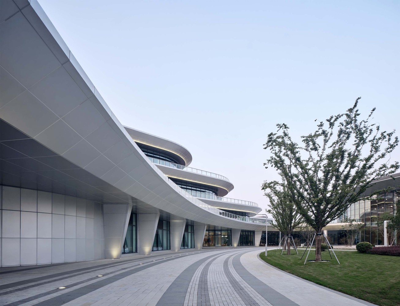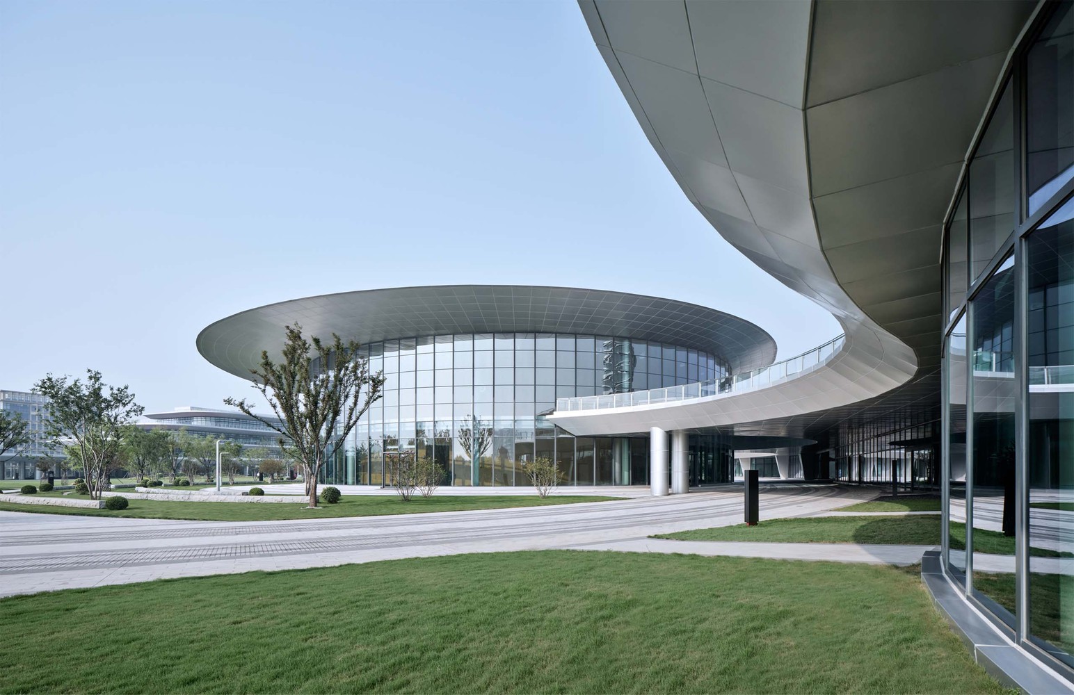 博海先進(jìn)技術(shù)研究院外表皮采用了新型建筑材料預(yù)制掛板,整體呈“C”字造形,“C型”體量圍合的城市公園朝秦皇河打開,成為城市南北綠軸的重要節(jié)點(diǎn)空間?!癈型”體量延申出二層平臺(tái)和跨河天橋也同時(shí)將秦皇河對(duì)岸的國(guó)際社區(qū)緊密連接起來。