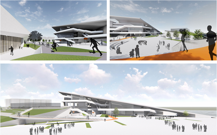 體育館項(xiàng)目包括一棟4層的綜合體育館和一棟室內(nèi)籃球館,兩棟建筑之間地下負(fù)一層相連通,地上設(shè)計(jì)了半籃球場(chǎng)、跑道等運(yùn)動(dòng)場(chǎng)地及設(shè)施。體育館屋面是可上人屋面,給市民提供一個(gè)休閑觀光的公共平臺(tái)。在建筑底部與水相接的地方,設(shè)計(jì)了一個(gè)與東江直接相連的無(wú)邊游泳池,建成后將是河源高新區(qū)一道靚麗的新景觀、新地標(biāo)!