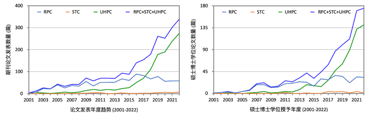 在中國(guó)知網(wǎng)(cnki.net)上,以“超高性能混凝土+UHPC”、“活性粉末混凝土+RPC”和“超高韌性混凝土+STC”(在中國(guó)使用的三個(gè)名稱(chēng))為主題詞,分別查詢(xún)過(guò)去二十年(2001-2022)每年在中文期刊發(fā)表的論文數(shù)量和碩士博士論文年度數(shù)量增長(zhǎng)趨勢(shì)見(jiàn)圖1a和1b。
