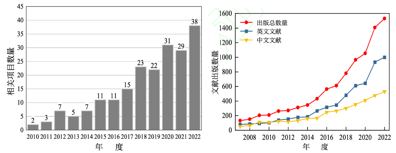 (a)中國(guó)年度國(guó)家項(xiàng)目數(shù)量趨勢(shì) (b)年度中英文文獻(xiàn)數(shù)量趨勢(shì)
