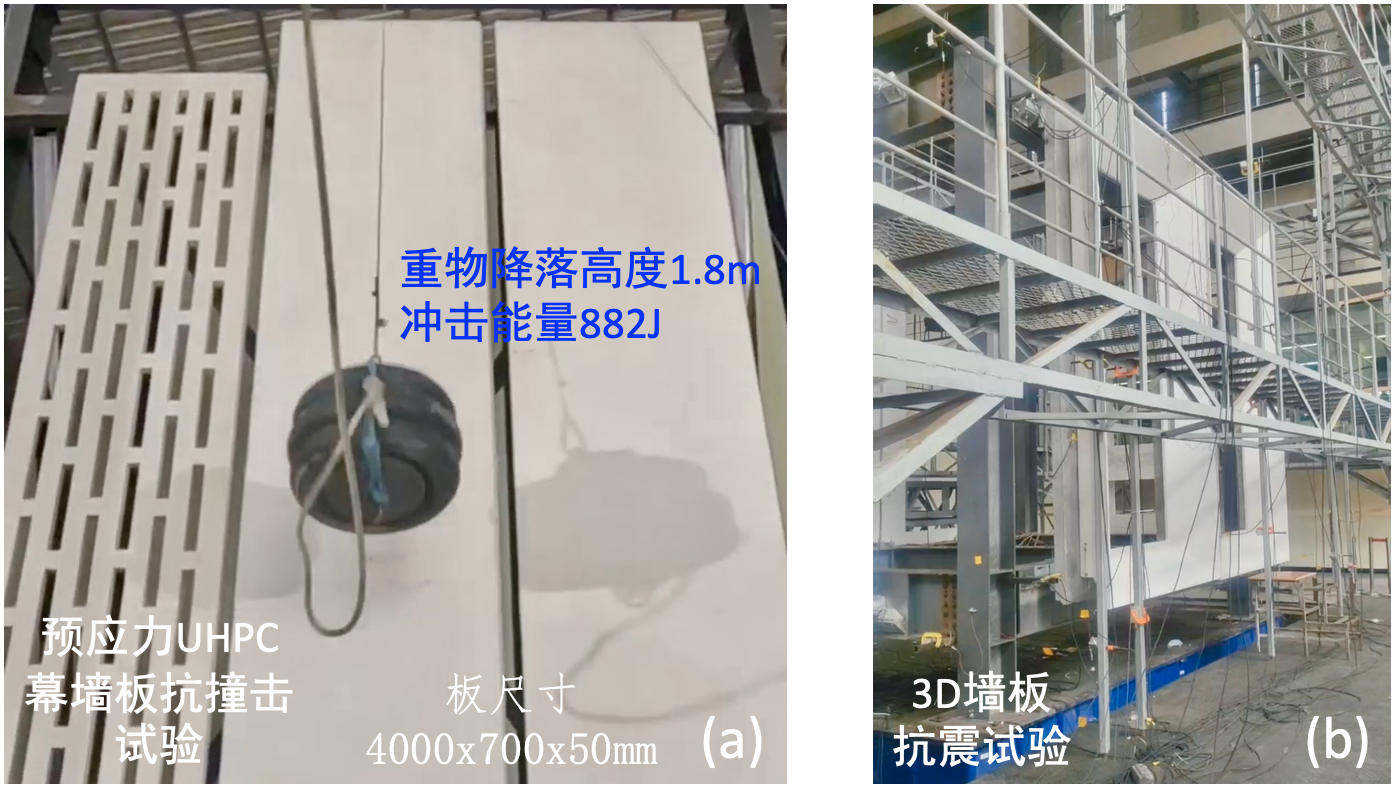 圖6 b是浙江寶思博新材料有限公司預(yù)制生產(chǎn)的UHPC外墻板實(shí)體正在進(jìn)行抗震試驗(yàn),經(jīng)歷模擬9.6級(jí)地震,僅墻板掛點(diǎn)處出現(xiàn)輕微裂縫,板體完好無(wú)損。試驗(yàn)證明,這種輕質(zhì)、立體(3D)構(gòu)造的UHPC外墻板及其安裝錨固節(jié)點(diǎn)具有優(yōu)異的抗震性能。
