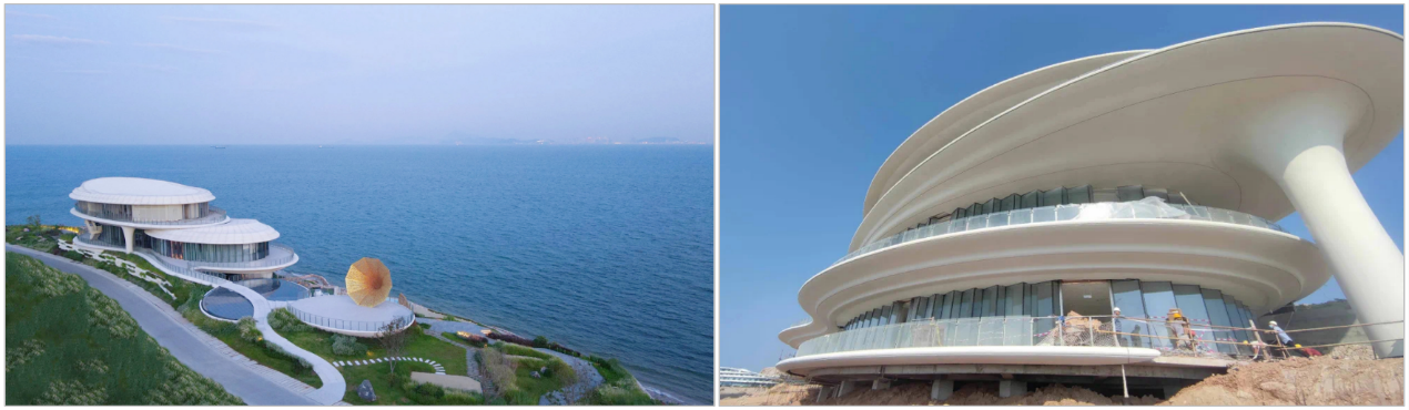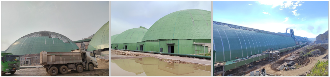 華新陽(yáng)新億噸機(jī)制砂石工廠是全球最大、最先進(jìn)的機(jī)制砂生產(chǎn)系統(tǒng),生產(chǎn)流程短、運(yùn)行穩(wěn)、能力大,能耗低于行業(yè)平均的30%以上,配套建設(shè)了綠色礦山和智慧物流。球形堆棚和生產(chǎn)線的封閉傳統(tǒng)上采用玻璃纖維增強(qiáng)塑料板(玻璃鋼),但耐候性不足,使用壽命較短。為此,華新超可隆使用UHPC材料開(kāi)發(fā)和生產(chǎn)了高韌性、高耐久的屋面瓦和墻面板產(chǎn)品,并在陽(yáng)新億噸機(jī)制砂石項(xiàng)目上應(yīng)用(見(jiàn)圖36),總面積高達(dá)347,000m2。