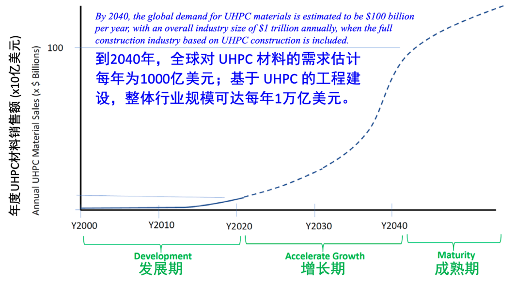 2023年中國(guó)在UHPC領(lǐng)域的多個(gè)方面取得重要進(jìn)展,發(fā)展勢(shì)頭良好,UHPC的價(jià)值也被更好地認(rèn)識(shí)到,并得到越來(lái)越多、越來(lái)越好地利用。那么,UHPC未來(lái)會(huì)有怎樣的發(fā)展?在美國(guó)UHPC 2023國(guó)際研討會(huì)上,加拿大V.H.(Vic) Perry先生作出了判斷“The Future of Ultra-High Performance Concrete(UHPC的未來(lái))”[16]。他使用喬布斯(Steve Jobs)的書(shū)中所提供的突破性技術(shù)市場(chǎng)發(fā)展基本規(guī)律——S形發(fā)展曲線,預(yù)測(cè)UHPC市場(chǎng)發(fā)展,認(rèn)為“到2040年,全球?qū)HPC材料的需求估計(jì)每年為1000億美元;基于UHPC的工程建設(shè),整體行業(yè)規(guī)模可達(dá)每年1萬(wàn)億美元”(見(jiàn)圖39)。
